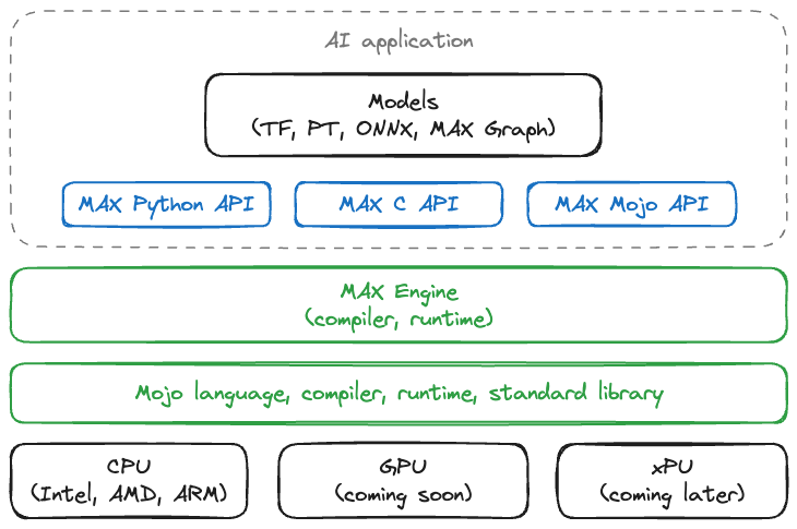 The foundation of MAX is Mojo, a common programming model for all AI hardware that aims to unify the entire AI stack, from graph kernels up to application layer, and provide a portable alternative to Python, C, and CUDA.