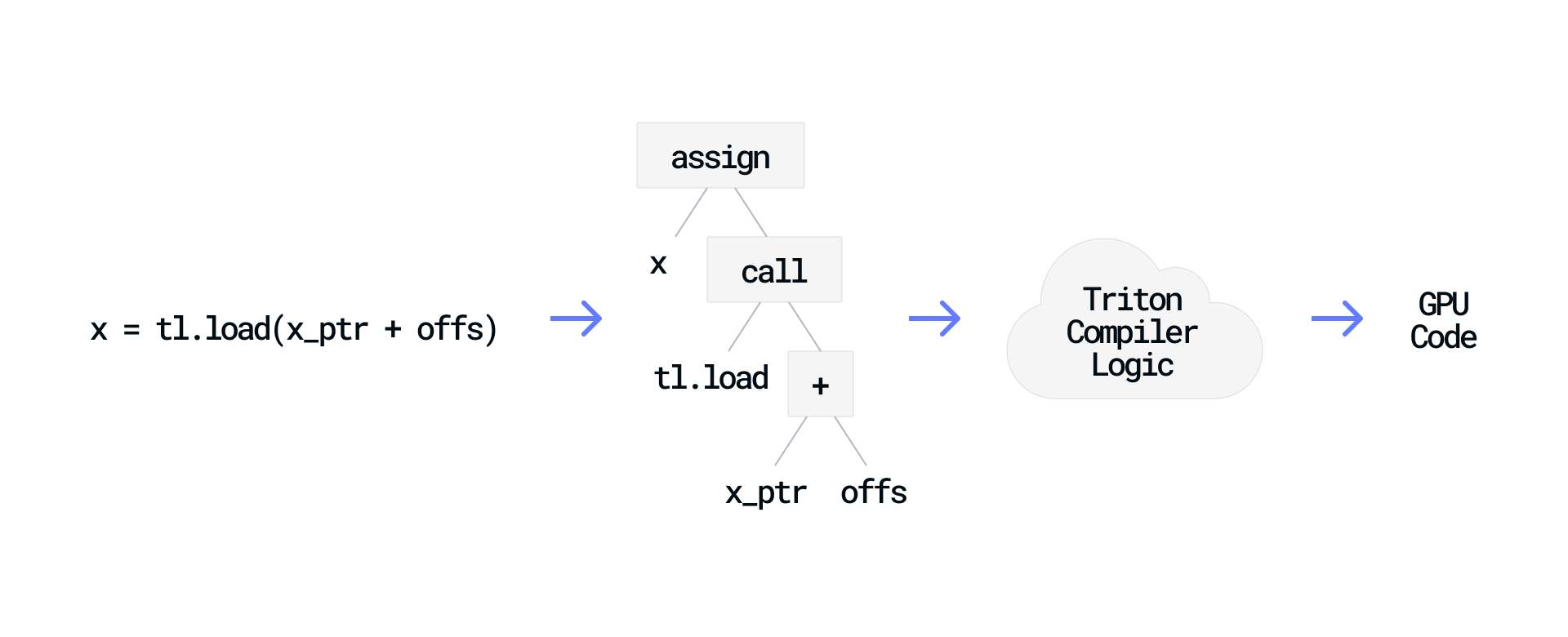When Triton receives this code, it parses the function into an Abstract Syntax Tree (AST) that represents the function's structure, including operations and data dependencies. This representation allows Triton to analyze patterns, apply optimizations, and generate efficient GPU code that performs the same operations.