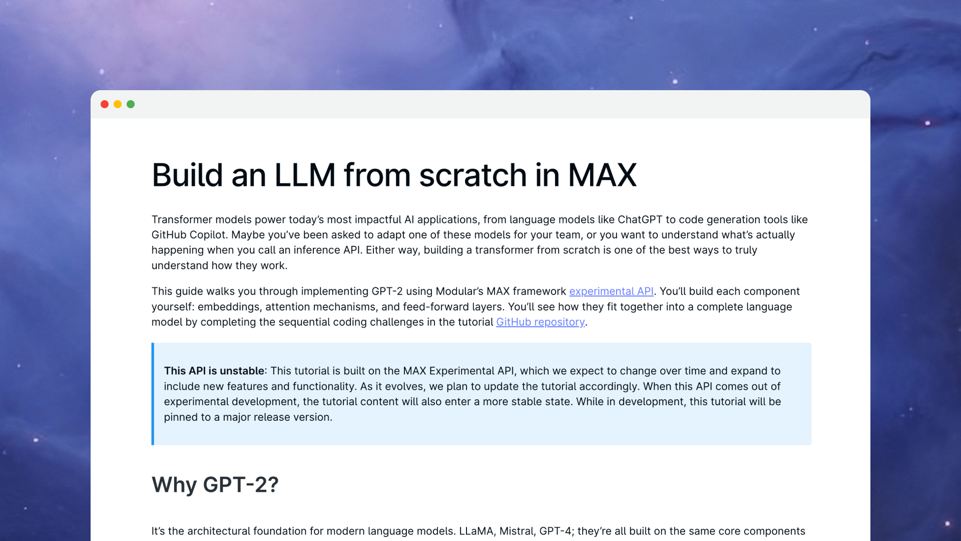 We released our new API for building custom models in MAX—and created a hands-on tutorial to showcase it. Build a transformer from scratch: embeddings, attention mechanisms, feed-forward layers, all the way to a working language model. The tutorial demonstrates how to construct production-quality models from first principles, giving you the foundation to implement novel architectures tailored to your specific use cases.