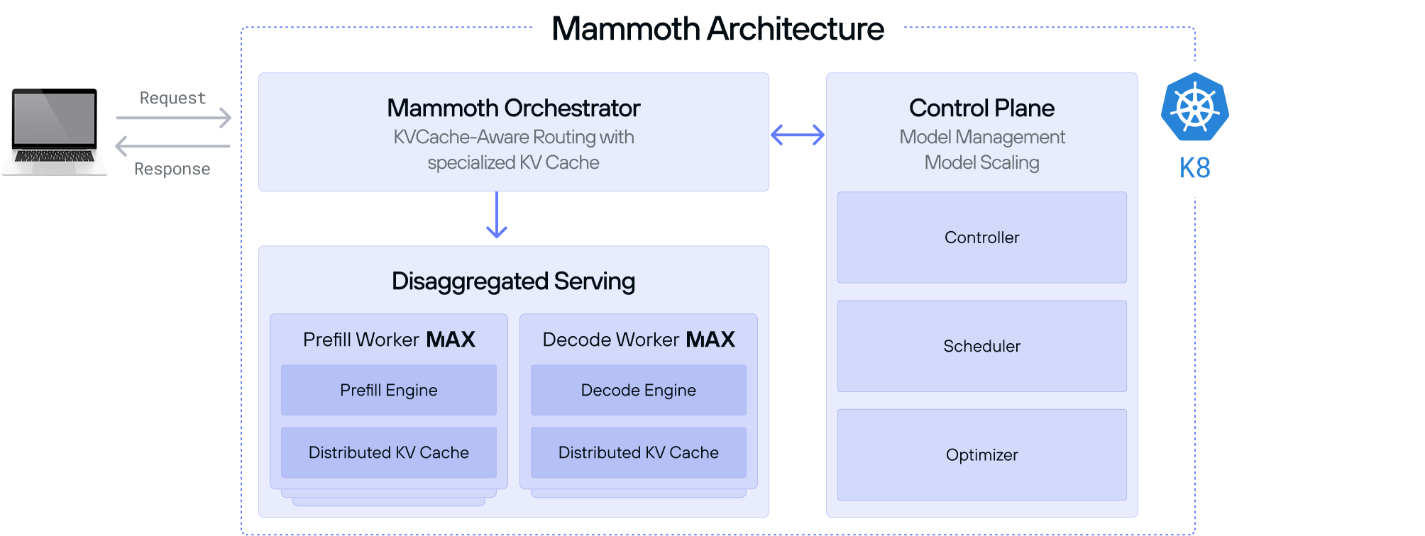 Mammoth consists of a lightweight control plane, intelligent router, and disaggregated serving backends, working together to efficiently deploy and run models across diverse hardware environments.